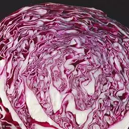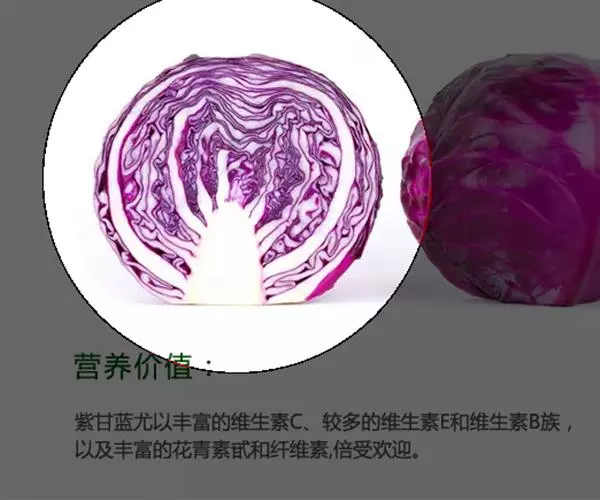 结球甘蓝中的一个类型,由于它的外叶和叶球都呈紫红色,故名紫甘蓝。紫甘蓝叶片紫红,叶面有蜡粉,叶球近圆形。它营养丰富,尤其含有丰富的维生素C、V和较多的维生素E和B族。在炒煮时,颜色成为黑紫色,十分美观;在欧洲地区主要作为色拉菜或西餐配色用,可用于生食、汤食、炒食。整棵购买时,可以将心挖除,用沾湿的报纸塞入其中,再用保鲜膜包起来。