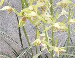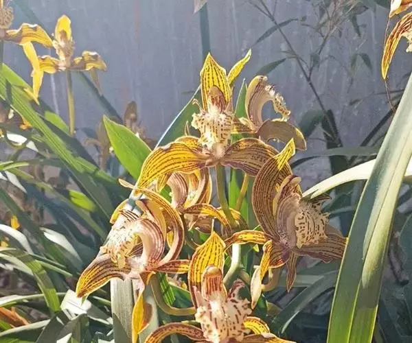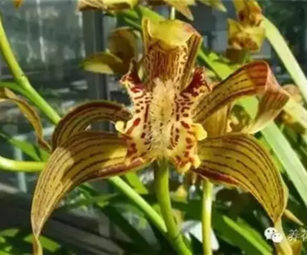 西藏虎头兰(学名:Cymbidium tracyanum L.):附生植物;假鳞茎椭圆状卵形或长圆状狭卵形,长5-11厘米,宽2-5厘米,大部分包藏于叶鞘之内。叶5-8枚或更多,带形。花葶从假鳞茎基部穿鞘而出,外弯或近直立;总状花序通常具10余朵花;花大,直径达13-14厘米,有香气;萼片与花瓣黄绿色至橄榄绿色,有多条不甚规则的暗红褐色纵脉;花瓣镰刀形,下弯并扭曲,长4.5-6.5厘米,宽7-12毫米;唇瓣卵状椭圆形,长4.5-6厘米,3裂。蒴果椭圆形。花期9-12月。