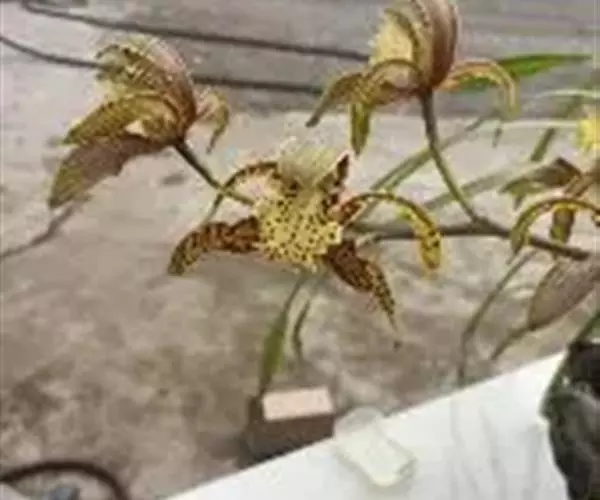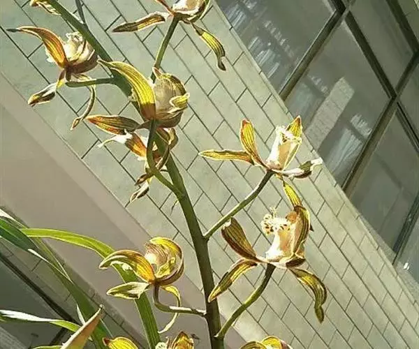 花葶从假鳞茎基部穿鞘而出,外弯或近直立,长65-100厘米或过之;总状花序通常具10余朵花;花苞片卵状三角形,长3-5毫米;花梗和子房长3-5.5毫米;花大,直径达13-14厘米,有香气;萼片与花瓣黄绿色至橄榄绿色,有多条不甚规则的暗红褐色纵脉,脉上有点,唇瓣淡黄色并在侧裂片上具类似色泽的脉,中裂片上则具短条纹与斑点,褶片淡黄色并有红点;萼片狭椭圆形,长(4.5-)5.5-7厘米,宽1.7-2厘米;侧萼片稍斜歪并扭曲。