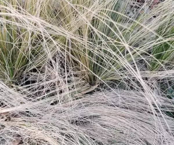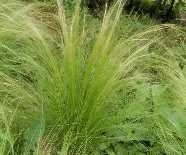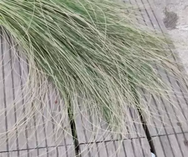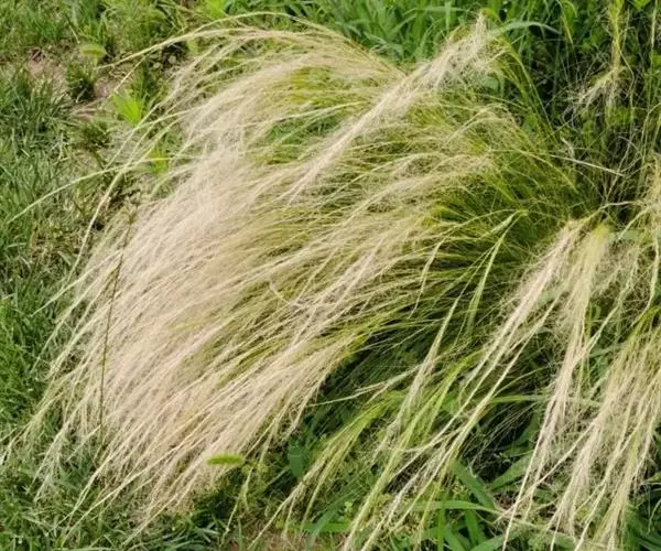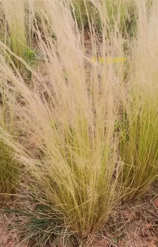 叶舌膜质,长4-8毫米;叶卷成细条形。圆锥花序狭窄,基部包于叶鞘内,长10-20厘米。小穗含1小花。颖狭披针形,先端纤细,长2.5-3.5厘米。外稃圆筒形,包卷内稃,长1-1.2厘米。基盘尖锐, 密生柔毛,芒二回膝曲,扭转,光滑, 第一芒柱长3.5-5厘米,第二芒柱长 1.2-2厘米,芒针卷曲成丝状,长 6-12厘米。