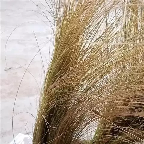 圆锥花序狭窄,几全部含藏于叶鞘内;小穗草黄或灰白色;颖尖披针形,先端细丝状,长2.5-3.5厘米,第一颖具1-3脉,第二颖具3-5脉(间脉多不明显);外稃长1-1.2厘米,背部具有排列成纵行的短毛,芒两回膝曲,光亮,边缘微粗糙,第一芒柱扭转,长4-5厘米,第二芒柱稍扭转,长约1.5厘米,芒针卷曲,长约10厘米,基盘尖锐,长2-3毫米,具淡黄色柔毛;内稃具2脉。颖果纺锤形,长6-7毫米,腹沟甚浅。花果期6-8月。