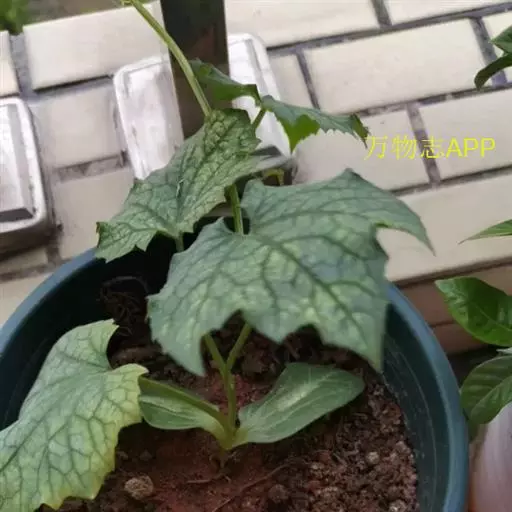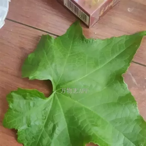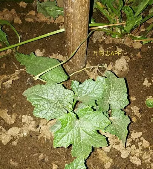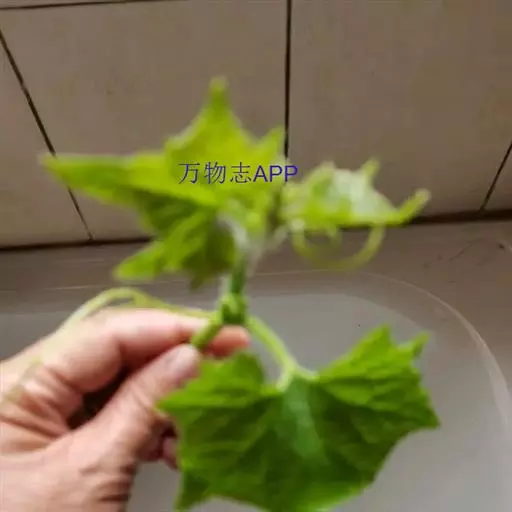 一年生攀援藤本;茎、枝粗糙,有棱沟,被微柔毛。卷须稍粗壮,被短柔毛,通常2-4歧。叶柄粗糙,长10-12厘米,具不明显的沟,近无毛;叶片三角形或近圆形,长、宽约10-20厘米,通常掌状5-7裂,裂片三角形,中间的较长,长8-12厘米,顶端急尖或渐尖,边缘有锯齿,基部深心形,弯缺深2-3厘米,宽2-2.5厘米,上面深绿色,粗糙,有疣点,下面浅绿色,有短柔毛,脉掌状,具白色的短柔毛。