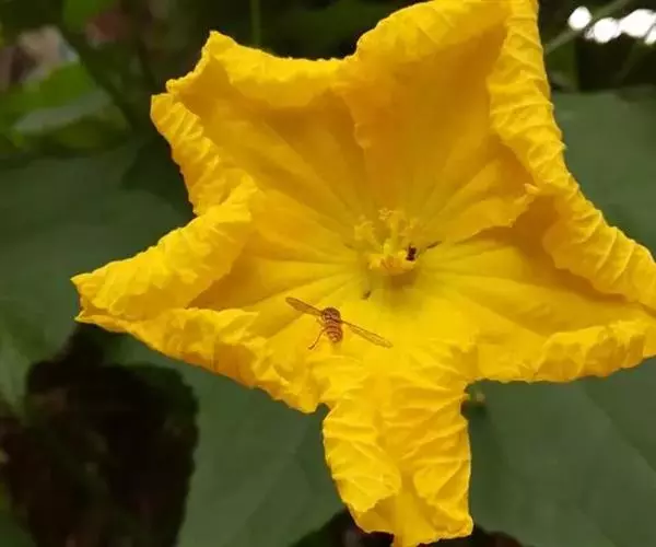 雌雄同株。雄花:通常15-20朵花,生于总状花序上部,花序梗稍粗壮,长12-14厘米,被柔毛;花梗长1-2厘米,花萼筒宽钟形,径0.5-0.9厘米,被短柔毛,裂片卵状披针形或近三角形,上端向外反折,长约0.8-1.3厘米,宽0.4-0.7厘米,里面密被短柔毛,边缘尤为明显,外面毛被较少,先端渐尖,具3脉;花冠黄色,辐状,开展时直径5-9厘米,裂片长圆形,长2-4厘米,宽2-2.8厘米,里面基部密被黄白色长柔毛,外面具3-5条凸起的脉,脉上密被短柔毛,顶端钝圆,基部狭窄;雄蕊通常5,稀3,花丝长6-8毫米,基部有白色短柔毛,花初开放时稍靠合,最后完全分离,药室多回折曲。雌花:单生,花梗长2-10厘米;子房长圆柱状,有柔毛,柱头3,膨大。