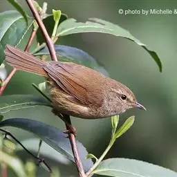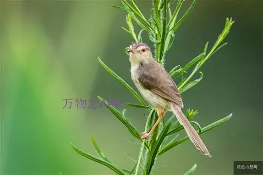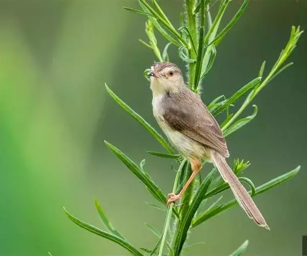 褐头鹪莺(学名:Prinia inornata):共有10个亚种。小型鸟类,体长11-14厘米。夏羽上体灰褐色,头顶较深,额沾棕,具一短的棕白色眉纹,飞羽褐色,羽缘红棕色。尾长呈凸状,外侧尾羽依次向中央尾羽明显缩短、灰褐色具不明显的黑色亚端斑和白色端斑。下体淡皮黄白色。冬羽尾较长,上体红棕褐色,下体淡棕色。