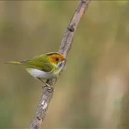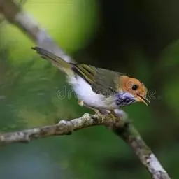 棕脸鹟莺:体长10厘米,是一种色彩亮丽而有特色的莺鸟。头栗色,具黑色侧冠纹。上体绿,腰黄色。下体白,…