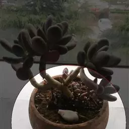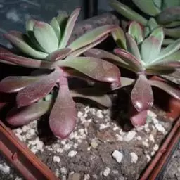 株高通常30厘米以内,茎直立,半木质化,随着植株的生长下部叶逐渐脱落在茎的顶端排列呈莲座状,肉质叶肥厚饱满,直立,匙形、长椭圆形,被白粉,在温差较大、阳光充足的环境中叶片呈红色至暗红色,非常漂亮。紫红色的花茎自叶腋抽出,小花钟状,在冬季或春季盛开。