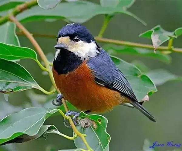杂色山雀(学名:Sittiparus varius):体重17-18克,体长125-140毫米。雌雄羽色相似。额、眼先、耳羽至颈侧乳黄色,头顶至后颈黑色,后头中央有一白斑。上背栗色,上体余部及翼蓝灰色。颏、喉黑色,喉与上胸间有一乳黄色横斑,胸、腹及两胁栗红色,胸和腹部中央至尾下覆羽淡黄褐色。虹膜褐色,嘴黑色,脚灰色。易与其它种山雀区别。