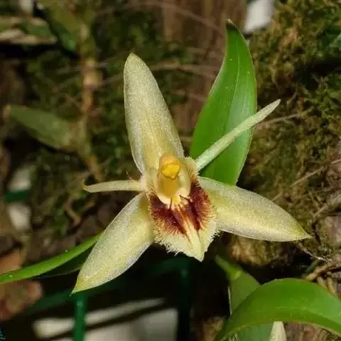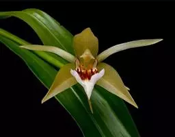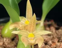 贝母兰根状茎较坚硬,多分枝,粗4-6毫米,密被有光泽的、革质的、鳞片状鞘。假鳞茎在根状茎上相距1.5-3厘米,长圆形或卵形,长(1-)2.5-6厘米,粗(0.5-)1-1.7厘米,干后皱缩而有深槽,顶端生2枚叶,基部具数枚鞘;鞘革质,卵形或卵状披针形,长2-6厘米。叶线状披针形,坚纸质,长(5-)10-17厘米,宽(4-)7-19毫米,先端长渐尖,基部渐狭,具不明显的短柄。