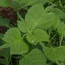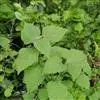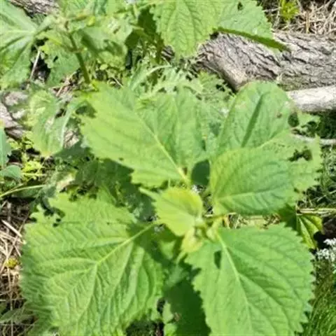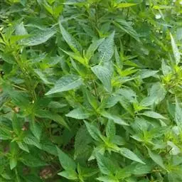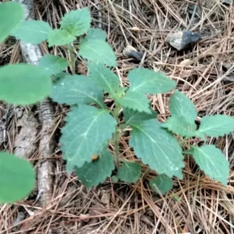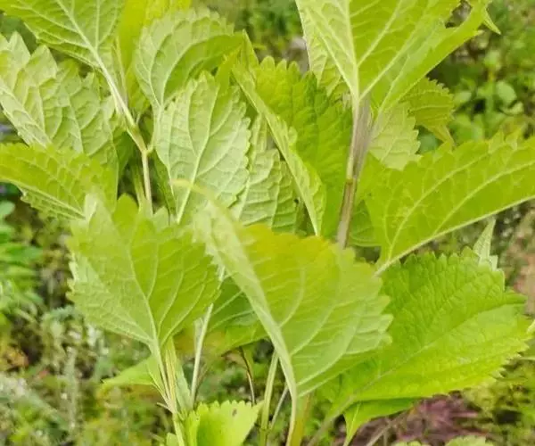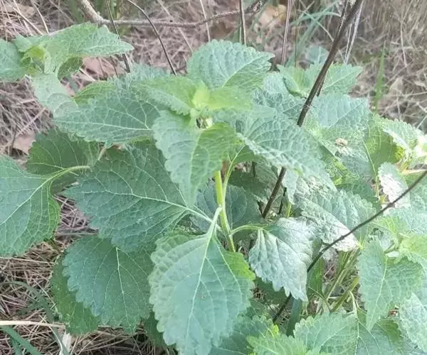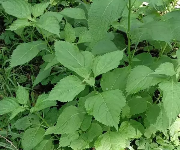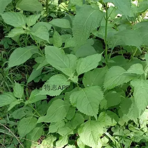 茎叶对生,圆形或圆状卵圆形,长(4)6-13厘米,宽3(4)-10厘米,先端具深凹,凹缺中有一尾状长尖的顶齿,顶齿长4-6厘米,基部渐狭至中肋,全缘或下部有1-2对粗锯齿,叶片基部宽楔形或近截形,骤然渐狭下延至叶柄,边缘在基部以上具粗大的牙齿状锯齿,齿尖具胼胝体,上面暗绿色,沿脉上密被微柔毛,余部散布糙伏毛伏小硬毛,下面淡绿色,沿脉上疏被微柔毛,余部无毛,散布淡黄色腺点,侧脉3-4对,两面隆起,平行细脉明显;叶柄长0.6-6厘米,向茎顶变短,腹凹背凸,疏被微柔毛,上部具翅。