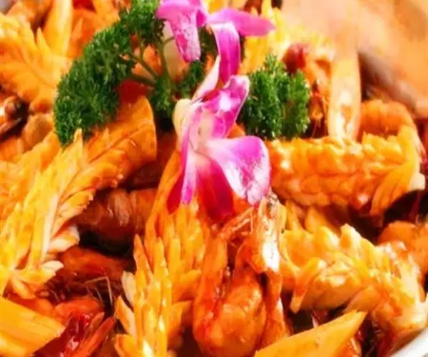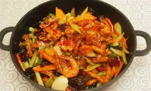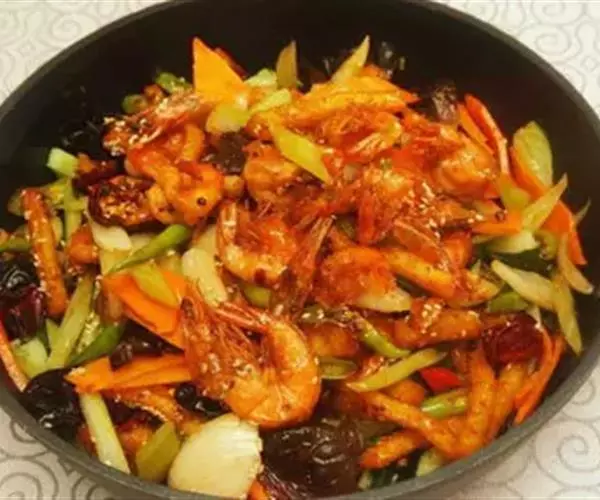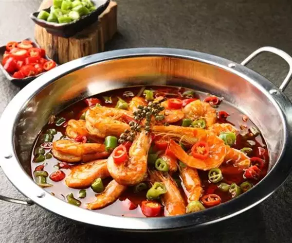 香锅虾是一道美食,制作原料主要有新鲜海虾、藕、洋葱。