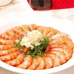1、虾去虾枪和虾须;藕切片,过开水焯熟,洋葱切粗丝,蒜切碎。