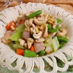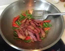 4、放入过好油的虾,翻炒到虾均匀地裹上酱料,再放入焯熟的藕片,翻炒均匀。