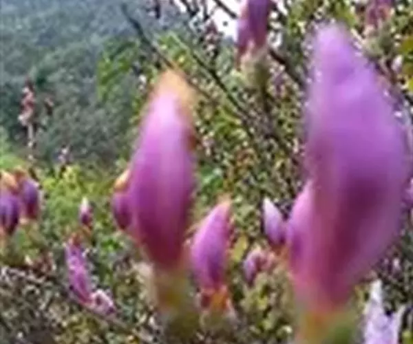 花芽卵球形,鳞片阔卵形,顶端钝尖,外面沿中脊以上被淡黄棕色绢状柔毛,边缘具睫毛。花通常2朵顶生,先花后叶,出自于同一顶生花芽;花梗直立,常为芽鳞所包,长7-10毫米,密被黄褐色柔毛;花萼环状,5浅裂,密被黄褐色柔毛;花冠漏斗形,淡紫红色或紫红色,长3-3.5厘米,花冠管长约1厘米,基部径4毫米,裂片5,深裂,长圆形,先端钝圆,上方裂片具紫红色斑点,两面无毛;雄蕊8-10,不等长,比花冠短或与花冠等长,花丝扁平,无毛,花药紫红色;子房卵球形,密被淡黄棕色长柔毛,花柱比雄蕊长,无毛。