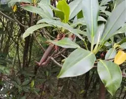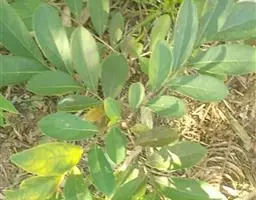 灌木或小灌木。树皮褐色,小枝干后黑褐色或棕揭色。单叶互生,表面绿色,干后墨绿色或榄绿色,背面浅黄色,干后灰色或灰黄色,倒卵形或狭椭圆形,长47至12毫米,宽18至10毫米,顶部钝圆、微凹入,中有一小凸尖,基部狭渐尖,全缘,表面主脉凹陷,背面主脉的两侧各有纵脉1条,两侧纵脉外的叶脉相连成网状;叶柄长4至7毫米;托叶三角形,长1.5至3毫米。