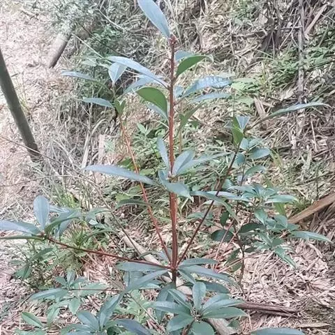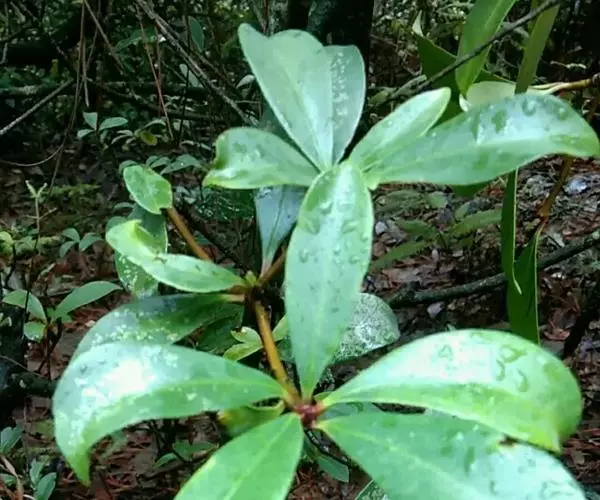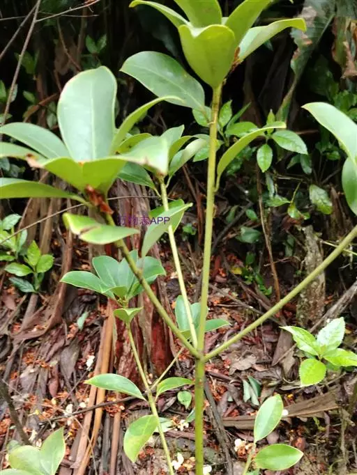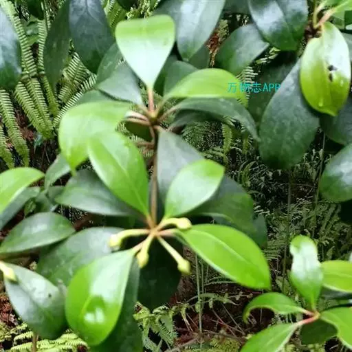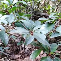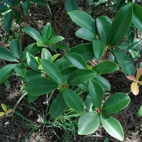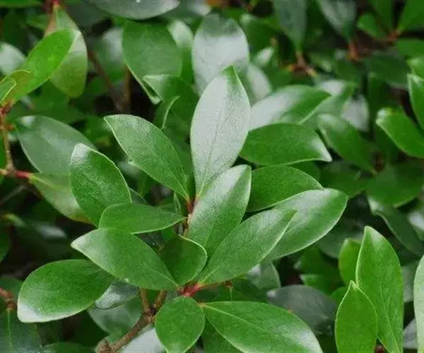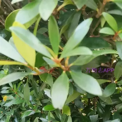 叶革质或薄革质,通常聚生于枝端,互生,叶片椭圆形、椭圆状倒卵形至长圆状倒卵形,长5.5-9厘米,宽2-3.5厘米,顶端短渐尖或急窄缩成短尖,尖头钝,基部楔形,边全缘,稀有上半部疏生浅疏齿,齿尖具黑色小点,上面深绿色或绿色,有光泽,下面浅绿色,干后常呈淡红褐色,中脉在上面稍凹下,在下面隆起,侧脉5-6对,两面均不明显,少有在上面隐约可见;叶柄长7-13毫米。