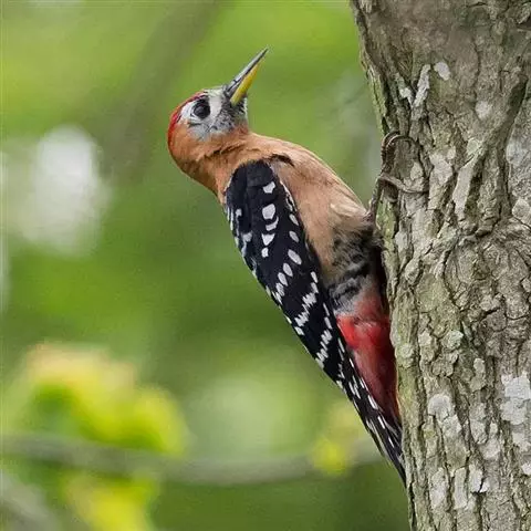 棕腹啄木鸟为啄木鸟科,啄木鸟属是中等体型的鸟类,体长约20厘米。头顶部具红色斑带。脚强健,有趾4个,…