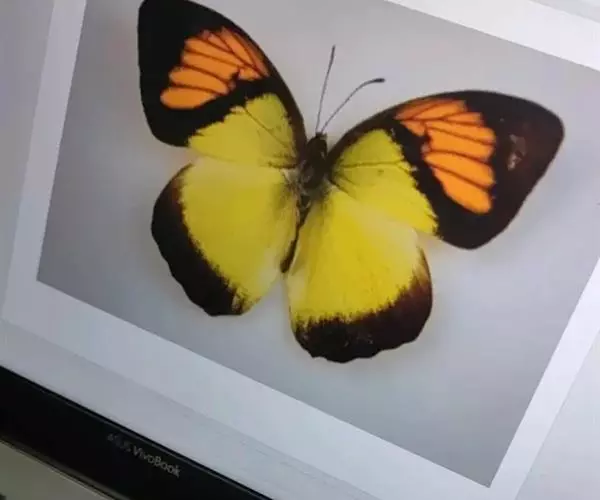 雌雄异型。雄蝶有2种形态,一种前翅正面端半部黑色,基半部为黄色,中域为大型橙色斑,中室端有黑斑,后翅黄色,外线黑带窄;另一种中室端为橙黄色斜带。