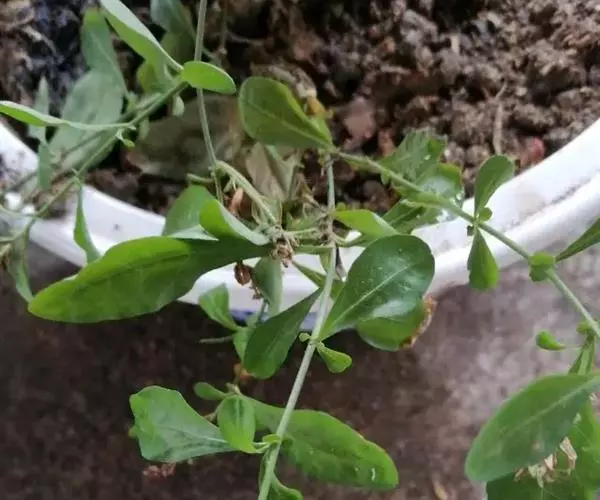 常绿柔弱半灌木,上端蔓状或极开散,高约1米或更长,除花序外无毛,被有细小的钙质颗粒。叶薄,通常菱状卵形至狭长卵形,有时(未充分发育的)椭圆形或长倒卵形,长(1)3-6(7)厘米,宽(0.5)1.5-2(2.5)厘米,先端骤尖而有小短尖,罕钝或微凹,基部楔形,向下渐狭成柄,上部叶的叶柄基部常有小形半圆至长圆形的耳。