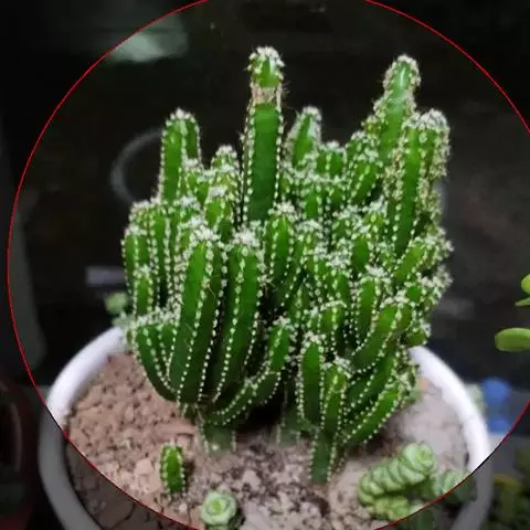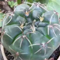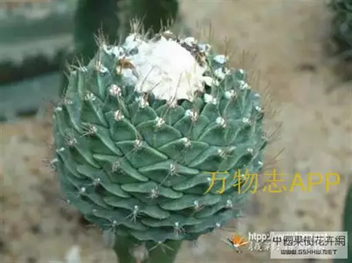 灰绿色三角形叶状疣突在茎部螺旋排列成莲座状,疣突背面有龙骨突。疣基部宽1.5~2.5cm,长1~1.5cm,肉质坚硬,刺座在疣突顶端,新刺座上有短绵毛,一般刺座长有刺2~4枚,刺较小,长1~1.5cm,刺细针状稍内弯,黄白色,早落。老株刺更易脱落,球体下部的疣状突起也易枯萎或脱落,形成树皮状的皱纹。花顶生,短漏斗状,花