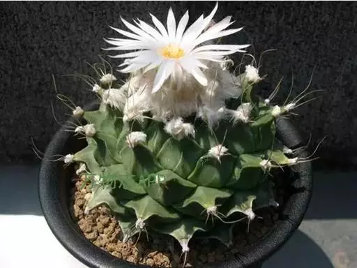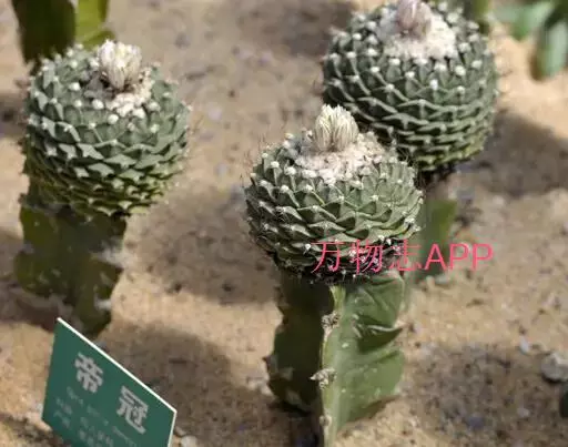 帝冠植株单生,属小型种,根粗大,变态茎形如陀螺,瘤状突起呈三角形,坚硬,呈几何形有序排列,非常特殊,是仙人掌植物中的代表种;盆栽帝冠可点缀窗台、书桌和案头,作为小摆设,是很难得的仙人掌类珍品。