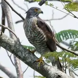蜂鹰属共有3种9 个亚种,属中型猛禽。其中代表物种凤头蜂鹰也称东方蜂鹰,体长为50~62厘米,体重800~1200克。头顶暗褐色至黑褐色,头侧具有短而硬的鳞片状羽毛,而且较为厚密,是其独有的特征之一。头的后枕部通常具有短的黑色羽冠,显得与众不同。虹膜为金黄色或橙红色,非常美丽。嘴为黑色,脚和趾为黄色,爪黑色。上体通常为黑褐色,头侧为灰色,喉部白色,具有黑色的中央斑纹,其余下体为棕褐色或栗褐色,具有淡红褐色和白色相间排列的横带和粗著的黑色中央纹。初级飞羽为暗灰色,尖端为黑色,翼下飞羽白色或灰色,具黑色横带,尾羽为灰色或暗褐色,具有3~5条暗色宽带斑及灰白色的波状横斑。凤头蜂鹰的体色变化较大,但通过头侧短而硬的鳞片状羽和尾羽的数条暗色宽带斑,可以同其他猛禽相区别。