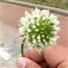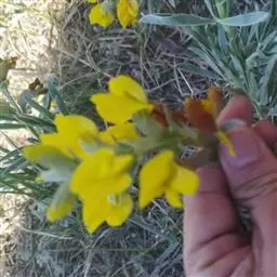 花通常4-9朵组成伞形花序生于叶状苞片内,叶状苞片排列成总状圆锥花序状,顶生或侧生,苞片与总轴均密被黄色绒毛;苞片宽椭圆形,长14-35毫米,宽9-25毫米,先端凹入,基部偏斜;花梗长2-4毫米,密被开展软毛;花萼钟状,长3-4毫米,被灰白色短柔毛,花冠白色或淡绿色,旗瓣长6-7毫米,宽3-4毫米,基部渐狭,具不明显的瓣柄,翼瓣长5-6毫米,宽约1毫米,基部具耳和瓣柄,龙骨瓣较翼瓣大,长7-8毫米,宽2毫米,基部多少有耳,瓣柄长约2毫米;雌蕊长8-10毫米,被毛,基部具小花盘,花柱纤细,弯曲,长5-6毫米,中部以下有毛。