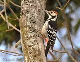 绒啄木鸟,北美洲最小的啄木鸟,白腹黑背和黑项,黑翼上有白色斑点。头部有黑白相间的条纹,尾巴短小,雄…