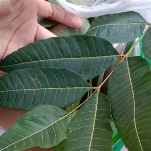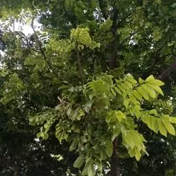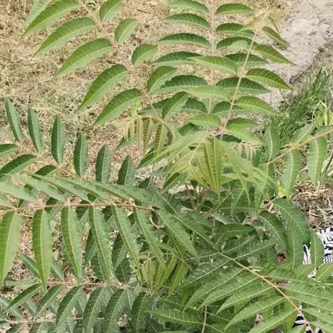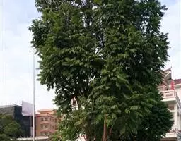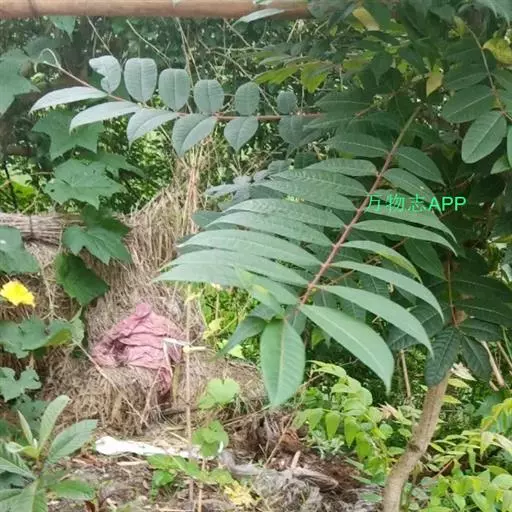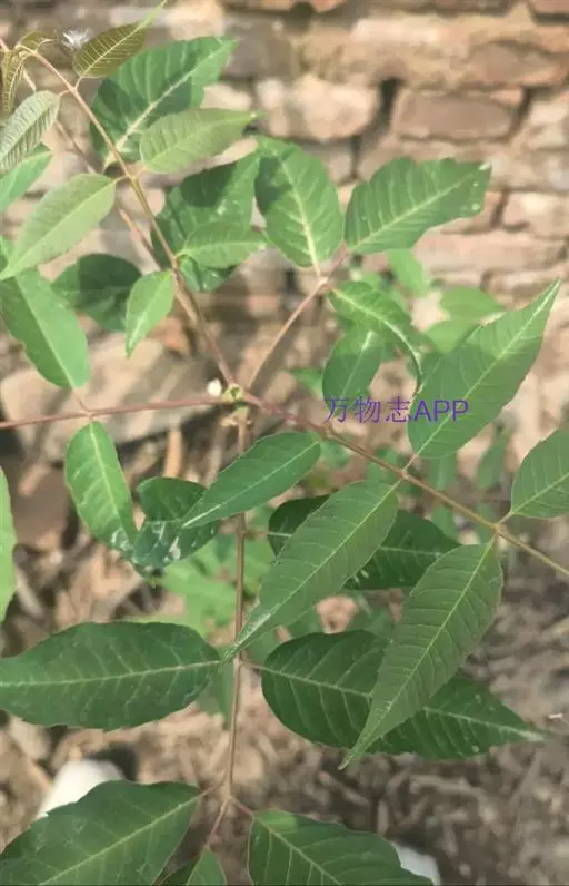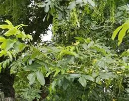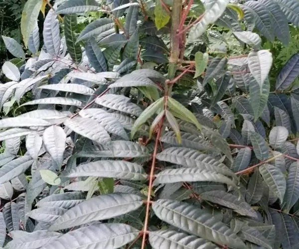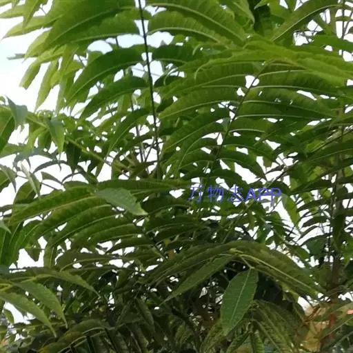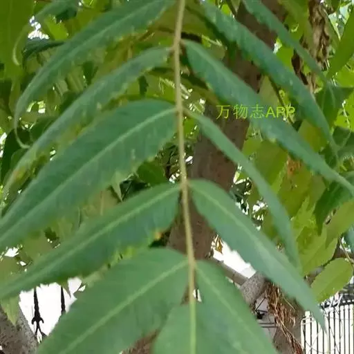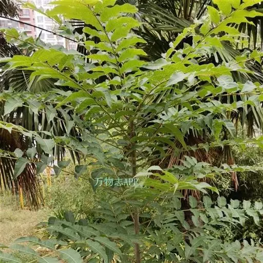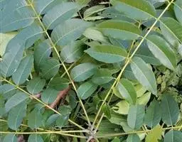 乔木;树皮粗糙,深褐色,片状脱落。叶具长柄, 偶数羽状复叶,长30-50厘米或更长;小叶16-20,对生或互生,纸质,卵状披针形或卵状长椭圆形,长9-15厘米,宽2.5-4厘米,先端尾尖,基部一侧圆形,另一侧楔形,不对称,边全缘或有疏离的小锯齿,两面均无毛,无斑点,背面常呈粉绿色,侧脉每边18-24条,平展,与中脉几成直角开出,背面略凸起;小叶柄长5-10毫米。
