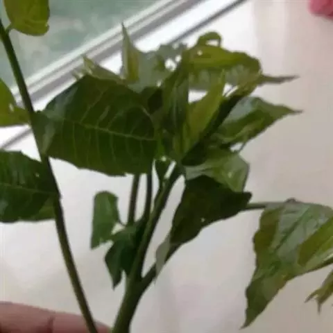 在采摘第2茬香椿时,将顶部同时摘掉定干(从离地面40厘米处打顶)。定干后喷洒15%多效唑溶液,浓度为200—500ppm,以控制顶端优势,促进分枝迅速生长,达到矮化栽培。此后根据树型发育情况,及时打顶、打杈,确保树冠多分枝、多产椿芽,达到高产优质。