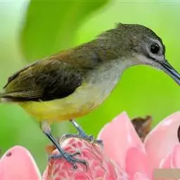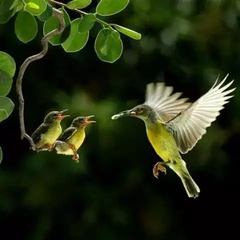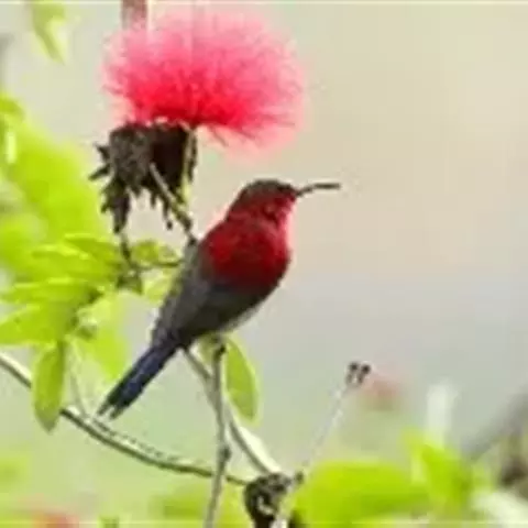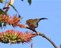 太阳鸟有细长微弯的嘴和管状的长舌,和蜂鸟一样以吸食花蜜为生。但遇到小甲虫和蜘蛛,也不放过开荤的机会,抓来充饥。它还是带翅膀的“月下老人”,为植物传授花粉。