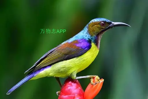叉尾太阳鸟,雀形目太阳鸟科太阳鸟属留鸟;为小型鸟类,雄鸟头顶辉蓝绿色,上体橄榄绿色,腰明黄色,…