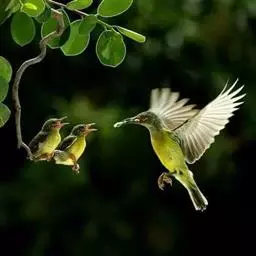 太阳鸟体重仅5~6克,连尾羽在内,最大的身长不超过15厘米。每当太阳初升,霞光映照,或者雨过天晴,万里蓝天的时候,太阳鸟和蝴蝶、蜜蜂等在万紫千红的百花丛中,成群飞翔。它们那鲜艳的羽 太阳鸟 衣,闪现红、黄、蓝、绿等耀眼的光泽,夺目异常,故名“太阳鸟”。当它们不停地挥动着短圆的小翅膀,轻捷地将长长的嘴,伸进花蕊深处吸食花蜜时,那悬停半空,倒吊身子的高难动作,简直和美洲的蜂鸟一模一样。所以,有人把它誉为“东方的蜂鸟”。 每年春季,是太阳鸟的繁殖季节。这时,双双对对,在森林边缘或沟谷坡地的灌木丛间筑巢。巢呈梨形,悬挂枝头,随风摆动。每巢产卵2~3枚,卵壳呈乳白色,间有细小的棕色斑点。