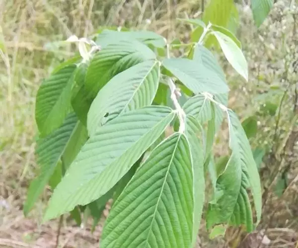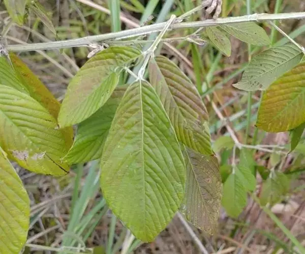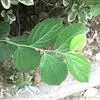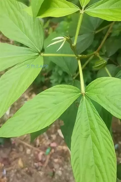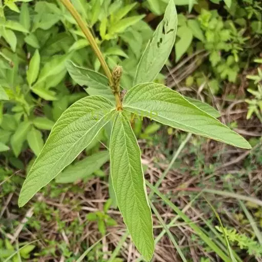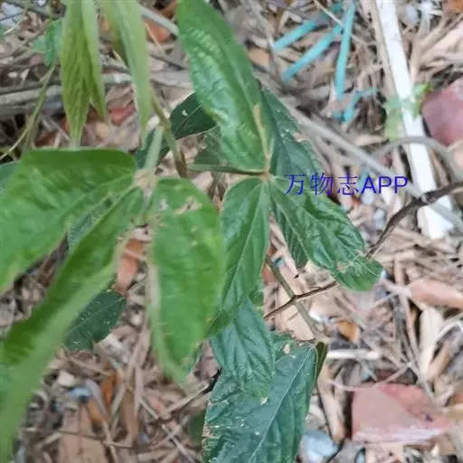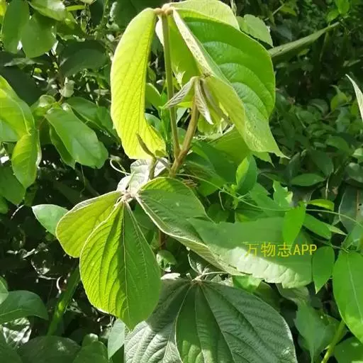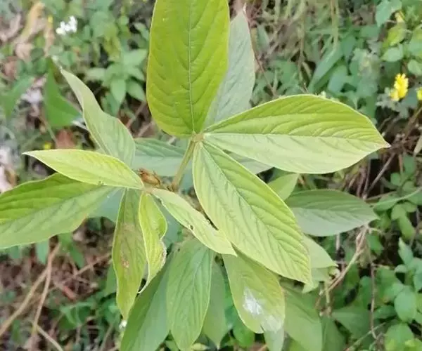叶具指状3小叶:托叶大,披针形,长可达2厘米,先端长尖,被短柔毛,具腺纹,常早落;叶柄长3-6厘米,具狭翅,被毛与幼枝同;小叶纸质或薄革质,顶生小叶宽披针形至椭圆形,长8-15厘米,宽4-7厘米,先端渐尖,基部楔形;基出脉3,两面除沿脉上被紧贴的柔毛外,通常无毛,下面被黑褐色小腺点,侧生小叶稍小,偏斜,基部一侧圆形,另一侧楔形;基出脉2-3;小叶柄长2-5毫米,密被毛。