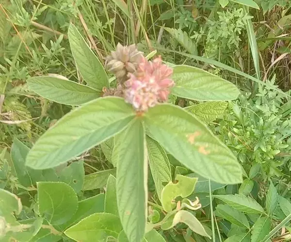 大叶千斤拔(学名:Flemingia macrophylla (Willd.) Prain)是豆科 ,千斤拔属直立灌木,高可达2.5米。幼枝有明显纵棱,叶具指状小叶:托叶大,叶片披针形,叶柄具狭翅,被毛与幼枝同;小叶片纸质或薄革质,总状花序,聚生于叶腋,花多而密集;花梗极短;花萼钟状,花序轴、苞片、花梗均密被灰色至灰褐色柔毛;花冠紫红色,旗瓣长椭圆形,翼瓣狭椭圆形,龙骨瓣长椭圆形,子房椭圆形,被丝质毛,花柱纤细。荚果椭圆形,种子球形光亮黑色。6-9月开花,10-12月结果。