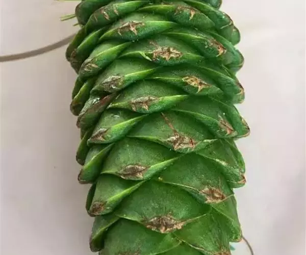 1.症状: 危害茎部及拟叶。夏季为橙色锈斑,表皮破裂后散出橙色粉末。秋季为暗褐色病斑。拟叶会因此而早期脱落,严重时整株变色枯死。