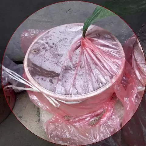 高压后叶片呈淡绿色,在塑料袋里长出白色的嫩根,并逐渐布满四周,说明高压成功,于9-10月在塑料袋下部将枝条剪下,轻轻拆去塑料薄膜,注意不要弄碎泥团,栽在花盆里,浇透水,放在遮荫处缓苗,经过10-15天,逐渐增加光照,不久就能长出新叶。