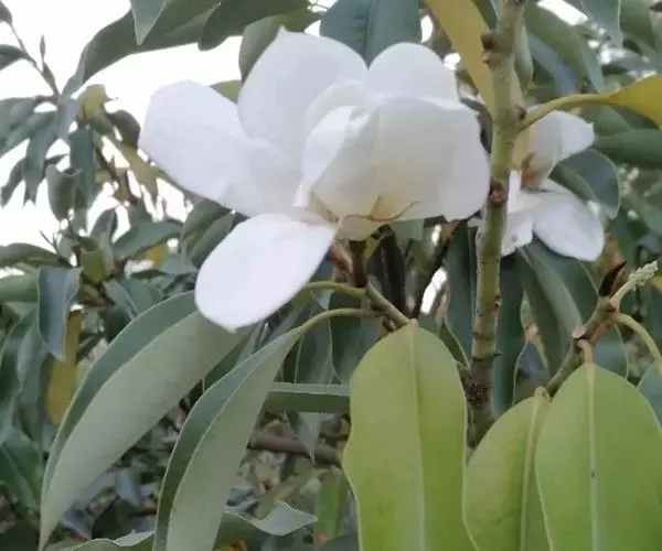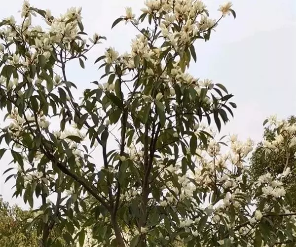 深山含笑的花 常绿乔木,高达20米,各部均无毛;树皮薄、浅灰色或灰褐色平滑不裂;芽、嫩枝、叶下面、苞片均被白粉。