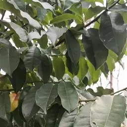 叶互生,革质深绿色,叶背淡绿色,长圆状椭圆形,很少卵状椭圆形,长7-18厘米,宽3.5-8.5厘米,先端骤狭短渐尖或短渐尖而尖头钝,基部楔形,阔楔形或近圆钝,上面深绿色,有光泽,下面灰绿色,被白粉,侧脉每边7-12条,直或稍曲,至近叶缘开叉网结、网眼致密。叶柄长1-3厘米,无托叶痕。