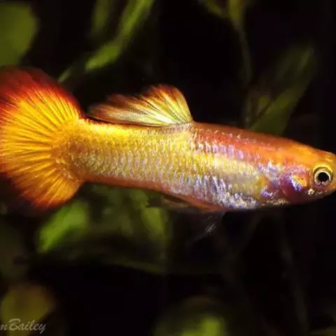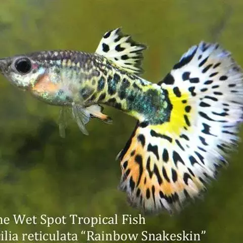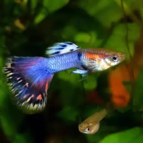 孔雀花鳉(Poecilia reticulata) ,俗名孔雀鱼,也称为凤尾鱼、彩虹花鳉、虹鳉、古比鱼等,是花鳉科花鳉属的一种热带鱼,雌雄鱼的体型和色彩差别较大,成年雄鱼身体瘦小,体长3-4厘米,体色绚烂多彩、体型优美;成年雌鱼体长5厘米左右,其尾柄及尾鳍占全身的1/3以上,各鳍均较雄鱼的短。较雄鱼体色逊色得多。