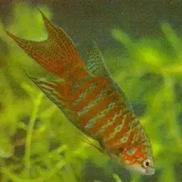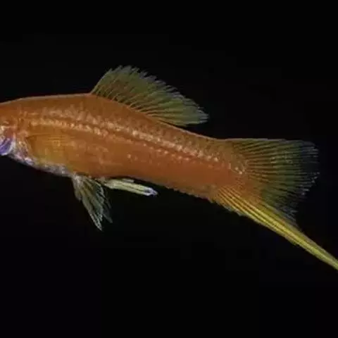 体黄褐色,具有金色光泽,但体色的变异很大,常具有鲜丽的橘黄色或蓝青色斑纹。成长后雌鱼的体色较单调而半透明,如同大肚鱼一般。较雄鱼体色逊色得多,多为单一银灰色,尾鳍上虽有一些花纹,均没有雄鱼的鲜艳。