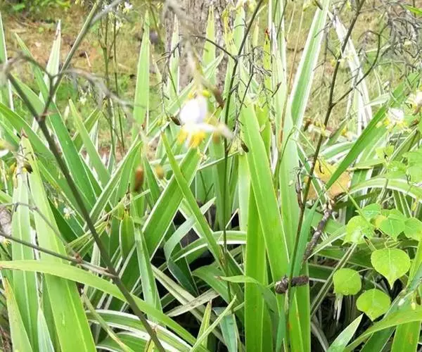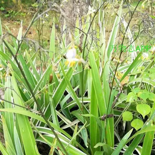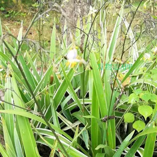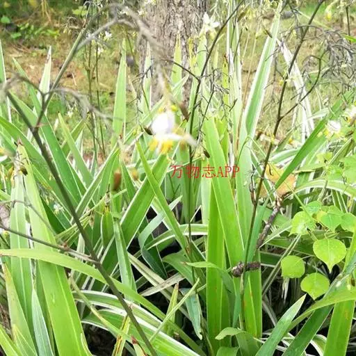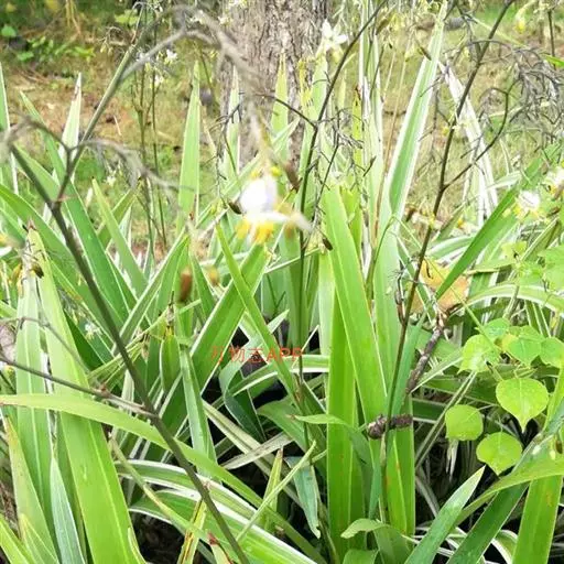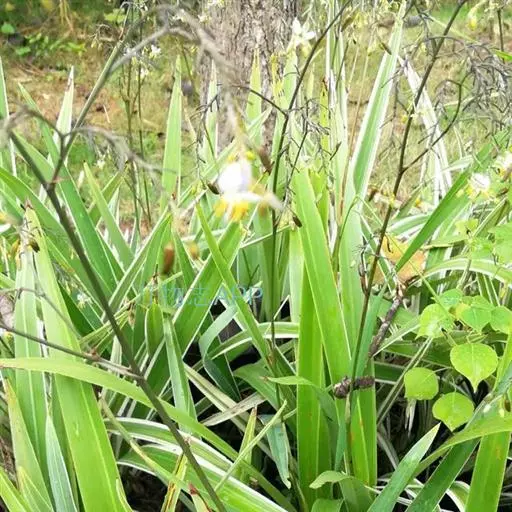 银边山菅兰 园艺栽培品种.草本,根状茎横走,结节状,节上生纤细而硬的须根.茎挺直,坚韧,近圆柱形.叶近基生,2列,叶片革质,线状披针彤,边缘有淡黄色边 ,长30~60 cm,宽1.0~2.5 cm.花葶从叶丛中抽出,圆锥花序长10~30 cm;花一般夏季开放,淡紫色、绿白色至淡黄色,小花梗短,苞片匙形,花被裂片6,二轮,披针形;雄蕊6;子房上位,花柱线状.