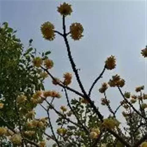 花为雌雄异株。伞形花序腋生,1-3个成簇状或短总状排列,开花前由4枚交互对生的总苞片所包裹,呈球形;总苞片近圆形,外面无毛,内面被绢毛,总梗长达7毫米,略被微柔毛或近无毛。雄花:每一伞形花序有花5朵;花小,黄绿色,花梗长约2毫米,被疏柔毛,花被筒短,外面密被疏柔毛,花被裂片4,宽倒卵圆形或近圆形,两面被贴生柔毛;能育雄蕊通常12,排成三轮,第一轮花丝无腺体,一第二、三轮花丝中部有一对无柄的肾形腺体,花药椭圆形,2室,室内向;子房不育。雌花:通常有退化雄蕊4,与花被片互生,花丝顶端有成对无柄的腺体,其间延伸有一披针形舌状体;子房1室,花柱短,柱头稍增大,钝三棱形。果卵珠形,熟时暗紫色。花期3-5月,果期6-9月。