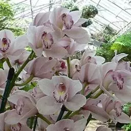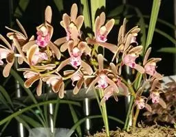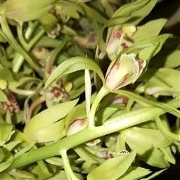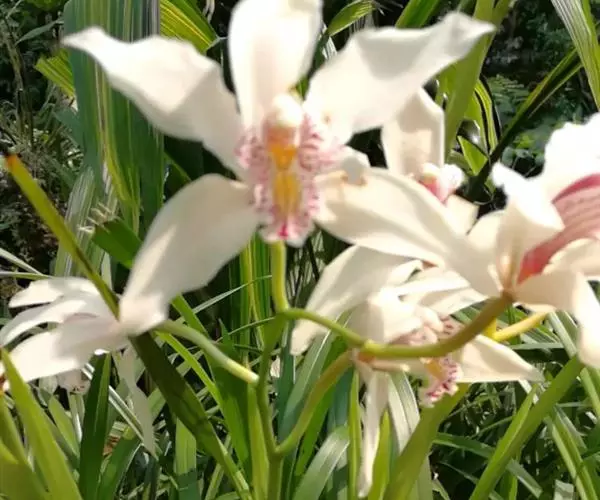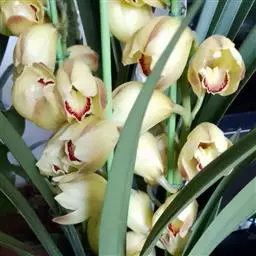 美花兰(学名:Cymbidium insigne Rolfe):地生或附生植物;假鳞茎卵球形至狭卵形,长5-9厘米,宽2.5-4厘米,包藏于叶基之内。叶6-9枚,带形。花葶近直立或外弯,较粗壮;总状花序具4-9朵或更多的花;萼片与花瓣白色或略带淡粉红色,有时基部有红点,唇瓣白色,侧裂片上通常有紫红色斑点和条纹,中裂片中部至基部黄色,亦有少数斑点与斑纹;花瓣狭倒卵形,长2.8-3厘米,宽1-1.2厘米;唇瓣近卵圆形,略短于花瓣,3裂。花期11-12月。