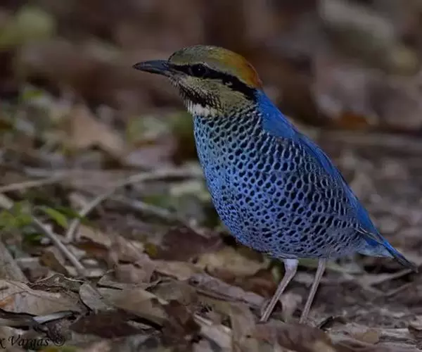 蓝八色鸫(学名:Pitta cyanea)是雀形目八色鸫科的鸟类,体长约24厘米,体重109克左右。体型圆胖,尾短,腿长。羽色鲜艳,头顶两侧橘黄色的宽带延伸至颈背,宽宽的过眼纹黑色,脸颊皮黄,髭纹黑,尾亮蓝色。雌鸟较雄鸟色暗,但下体的白色仍清楚可见。