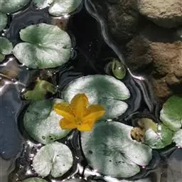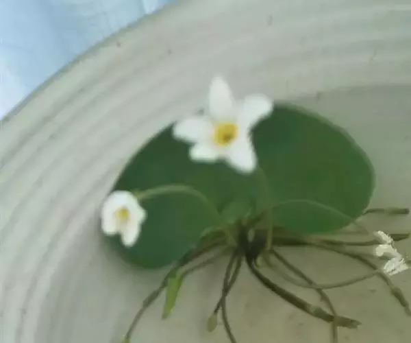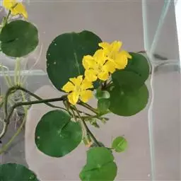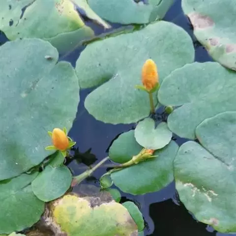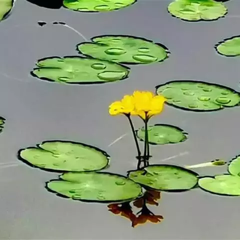 金银莲花是多年生水生草本。茎圆柱形,不分枝,形似叶柄,顶生单叶。叶飘浮,近革质,宽卵圆形或近圆形,长3-18厘米,下面密生腺体,基部心形,全缘,具不甚明显的掌状叶脉,叶柄短,圆柱形,长1-2厘米。