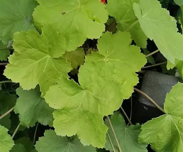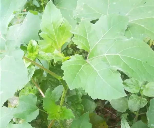 叶三角状卵形或心形,长4-9厘米,宽5-10厘米,近全缘,或有3-5片不明显浅裂,顶端尖或钝,基部稍心形或截形,与叶柄连接处成相等的楔形,边缘有不规则的粗锯齿,有三基出脉,侧脉弧形,直达叶缘,脉上密被糙伏毛,上面绿色,下面苍白色,被糙伏毛;叶柄长3-11厘米。