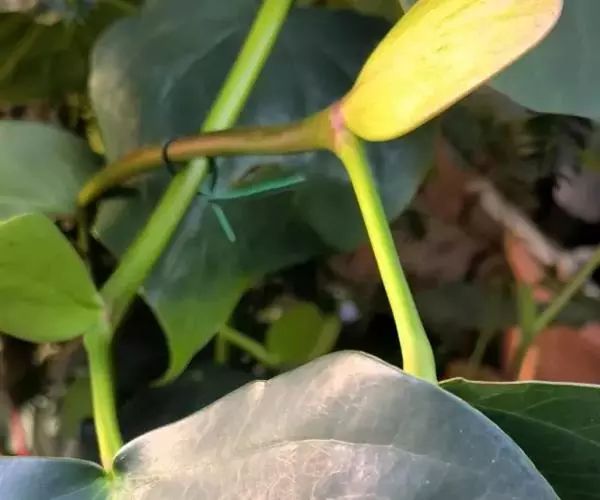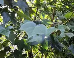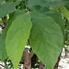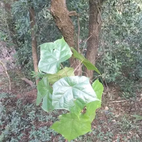 叶革质,阔卵圆形,全缘,或嫩叶有掌状3浅裂,长10-17厘米,宽9-13厘米,嫩叶有时更大;先端尖锐,基部心形,或偶为短的阔楔形,上面深绿色,发亮,下面无毛;掌状脉5-7条,在上面明显,在下面突起,网脉在上下两面均明显;叶柄长3-6厘米,嫩叶的叶柄更长,圆筒形,无毛;托叶椭圆形或倒卵形,长2-3厘米,宽1-2厘米,有明显的脉纹。
