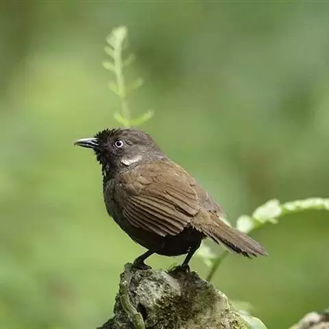 黑顶噪鹛:中型鸟类,体长24-26厘米。前额、脸、颏、喉黑色,头顶黑褐沾棕或深棕橄榄褐色,…