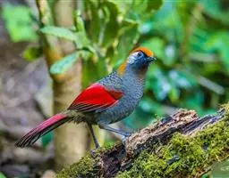 赤尾噪鹛中型鸟类,体长24~28厘米。头顶至后颈红棕色,两翅和尾鲜红色,眼先、眉纹、颊、颏和喉黑色,…
