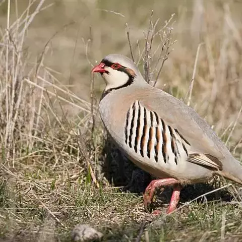 体大的灰褐色鹑类。胸灰色具黑色细纹。与相似种类四川雉鹑不同处在于栗色喉块外缘近白。有猩红色眼周裸皮。…